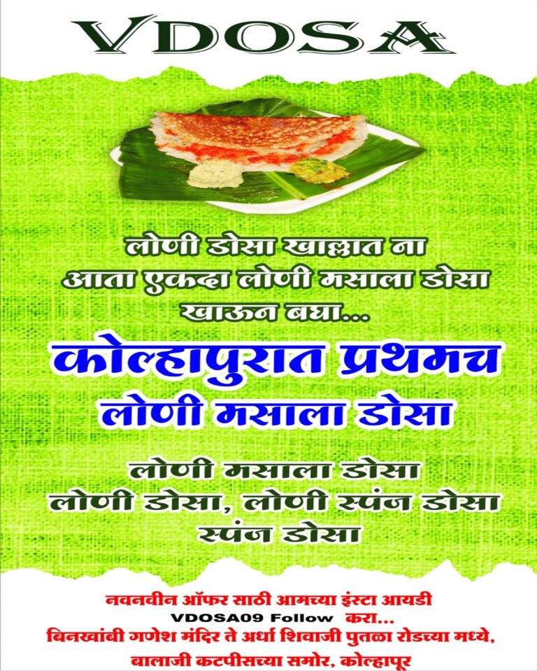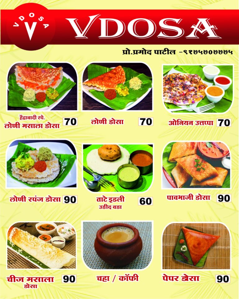 Good Place. Good Food. A Really Good Place to Eat In the City of Kolhapur Scroll Down Discover the Good Atmosphere of Vdosa. “Discover the warm and inviting atmosphere of V Dosa, home to Kolhapur’s special Loni Dosa, where every bite is a taste of tradition and delight!” Good Vibes “Feel the good vibes, savor the great flavors at V Dosa. Where every moment is a celebration of taste and joy.” Cozy Place To make everyone entering the establishment feel at homeand find their atmosphere. Relax Atmosphere “Experience serenity with every bite at V Dosa. Where great taste meets a calm, relaxing vibe.” Our Menu Get Relax. Eat. V-Dosa Haydrabadi Special Loni Masala Dosa - 70.00 Loni Dosa - 70 Oninon Dosa-70 Loni Spong Dosa-90 Tatte Idli - 50.00 Pavbhaji Dosa - 90 Paper Dosa-90 Cheese Dosa-90 View All Menu Homemade Signature Menu “Signature Menu at V Dosa: Featuring our special Kolhapuri Loni Dosa, crafted with love, tradition, and unmatched flavor!” Menu “Indulge in V Dosa’s flavorful journey, from crispy dosas to Kolhapur’s special Loni delight!” Book A Menu Now Telephone Reservations 9175707775 Send Us a Message Massa praesent sit suspendisse ac volutpat amet. Commodo elit at non neque ullamcorper id. Please enable JavaScript in your browser to complete this form.Name *Email *Message *CommentSend Message